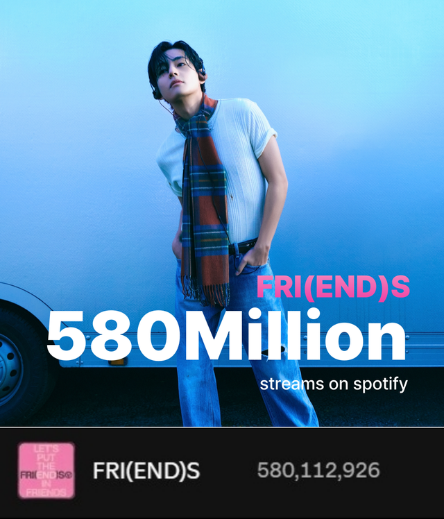 [스포츠동아 양형모 기자] 방탄소년단 뷔의 솔로곡 ‘프렌즈’가 스포티파이 5억8000만 스트리밍을 돌파하며 글로벌 팬들의 꾸준한 사랑을 다시 입증했다.