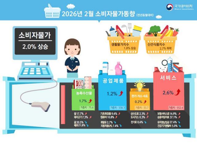 2월 소비자물가지수가 전년 동월 대비 2.0% 상승하며 전월과 동일한 오름세를 유지했다. 공업 제품과 서비스 가격이 상승을 견인한 가운데 기상 여건에 따라 가격 변동이 큰 신선식품 지수가 하락으로 돌아서며 전체 물가 상승 압력을 일부 완화하는 모습을 보였다.