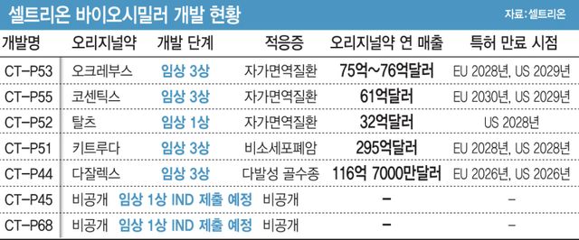 이중 셀트리온이 공개한 주요 파이프라인은 자가면역질환 치료제 오크레부스(CT-P53)·코센틱스(CT-P55)·탈츠(CT-P52), 항암제 키트루다(CT-P51)·다잘렉스(CT-P44) 등이다. 이 가운데 대부분이 글로벌 임상 3상을 진행하며 개발 막바지 단계에 접어들었다.