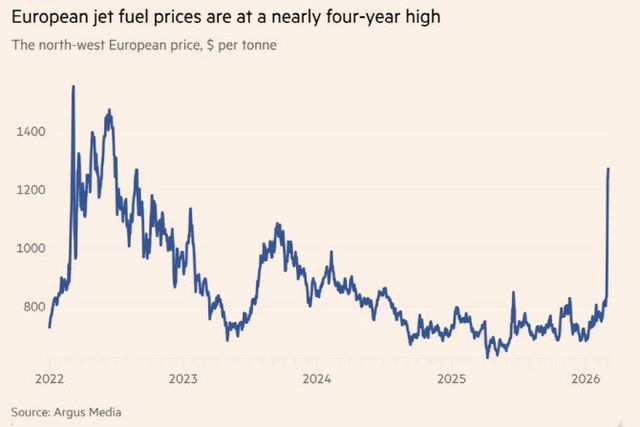 5일(현지시간) 가격 정보기관 아거스(Argus)에 따르면 주요 항공사들의 글로벌 계약 가격 기준이 되는 북서유럽 항공유 가격은 이날 톤당 1416달러(약 208만원)로 12% 상승했다. 2022년 6월 이후 약 4년 만에 최고치다. 주간 기준으로는 71% 폭등했다. 브렌트유 대비 프리미엄은 배럴당 약 97달러(약 14만원)로 사상 최고 수준을 나타냈다.