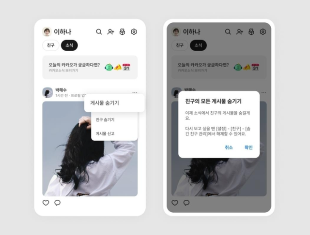 이제 카카오톡 친구탭 소식 피드에서 원치 않는 게시물을 숨길 수 있게 됐다.