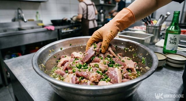 손질한 오리는 청주와 잘게 썬 청양고추를 넣어 잠시 재워 둔다. 약 20분 정도 두면 고기의 향이 부드러워지고 매콤한 향도 자연스럽게 배어든다.