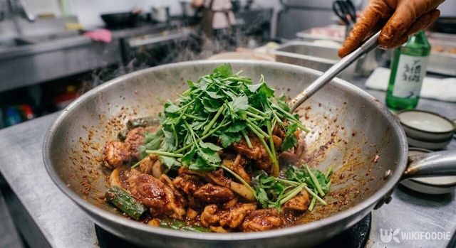 재료가 모두 익으면 불을 끄고 참나물을 넉넉하게 올린다. 팬의 남은 열기로 참나물이 살짝 숨이 죽으면 향이 살아난다. 너무 오래 볶지 않는 것이 중요하다.