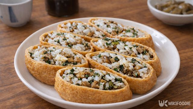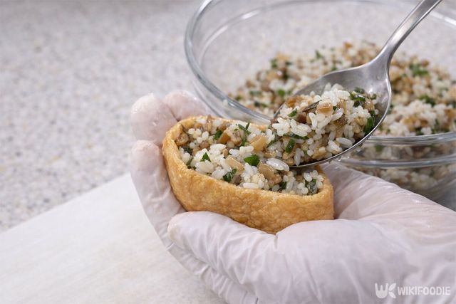 7. 완성된 밥을 유부 속에 적당히 채워 담는다.