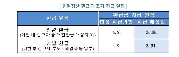 연말정산 환급금의 법정 지급기한은 4월 9일이지만, 국세청은 그보다 22일 이른 3월 18일에 연말정산 환급금을 회사에 지급할 예정이다.