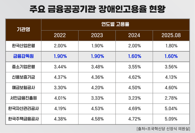 그런데 정치권과 여론 안팎에선 이날 이 원장의 발언을 두고 '내로남불'이라는 비판의 목소리가 적지 않은 것으로 나타났다. 오랜 기간 장애인 고용을 외면하다시피 해 온 금감원의 과거 전력 때문이다. 조국혁신당 신장식 의원실이 지난해 10월 발표한 자료에 따르면 금감원은 지난 2022년부터 2025년 8월까지 주요 8개 금융공공기관 중 4년 연속 장애인 고용율 '꼴찌'를 기록했다. 금감원의 연도별 장애인 고용률은 ▲2022년(1.9%) ▲2024년(1.9%) ▲2024년(1.6%) ▲2025년 8월(1.6%) 등이었다. 지난해 가장 높은 고용률을 보인 한국주택금융공사(5.09%)와는 무려 3%p 이상 차이나는 수준이다.