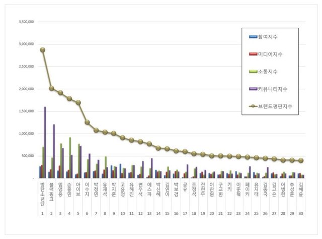영예의 1위를 거머쥔 방탄소년단(RM, 진, 슈가, 제이홉, 지민, 뷔, 정국)은 참여지수 27만 875, 미디어지수 29만 7,191, 소통지수 70만 5,644, 커뮤니티지수 160만 2,675를 기록하며 총 브랜드평판지수 287만 6,385로 분석됐다. 이는 지난 2월 브랜드평판지수인 159만 57과 비교해 무려 80.90%나 급상승한 결과다.