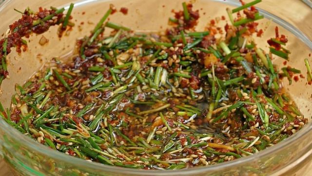 기준은 밥숟가락 계량이다. 달래 약 2컵, 약 80g 정도 분량을 기준으로 간장은 8큰술 정도 넣는다. 여기에 참기름과 통깨는 각각 3큰술, 고춧가루는 2큰술, 간 마늘과 설탕은 각각 1큰술 정도 넣는다.