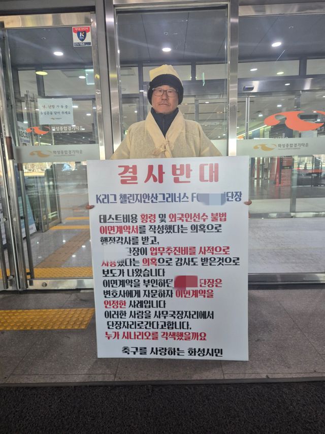 2024년 12월 A의 사무국장 취임 반대 시위를 벌였던 김원태 화성 유소년 디렉터는 최근 또 한 번 화성시종합경기타운 앞에서 상복을 입고 ‘결사반대’ 피켓을 들었다.