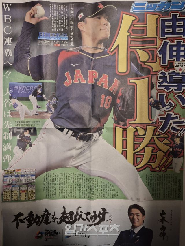 승리 직후 도쿄돔 밖에서는 호외가 배포됐다. 일본 매체 닛칸스포츠가 제작한 특별판에는 '사무라이 재팬이 세계 1위 연속 우승을 향한 전투가 야마모토의 투구로 막이 올랐다'며 경기 내용을 조명했다. 지면에는 야마모토의 투구 장면과 오타니의 홈런 순간 등이 사진으로 담겼다. 한 장짜리로 제작된 호외의 뒷면에는 야마모토가 모델로 등장한 광고가 실렸다.