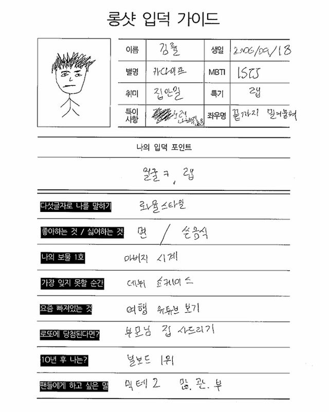 오율 - 평소 제 헤어스타일과 두꺼운 입술 등 특징을 나름대로 담았어요. 런닝을 취미라고 썼는데 대표님하고도 요즘 열심히 뛰어요. 물론 멤버들과도 같이 하기도 하고요.