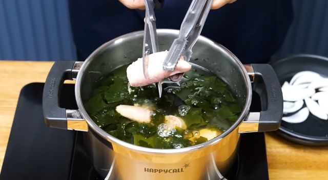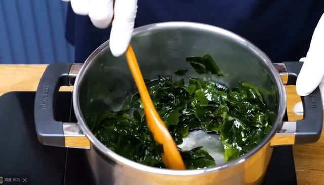 볶은 미역에 물 1L를 붓고 뚜껑을 닫아 15분 정도 끓여준다. 이후 양파 반 개를 썰어 두고, 물이 끓어오르면 가스불을 끄고 미리 썰어 둔 양파를 한 스푼 정도 넣는다. 이후 명란젓을 넣고 2분간 담가두면 명란젓의 비린 맛이 빠지고 국물이 깔끔해지는 걸 볼 수 있다.