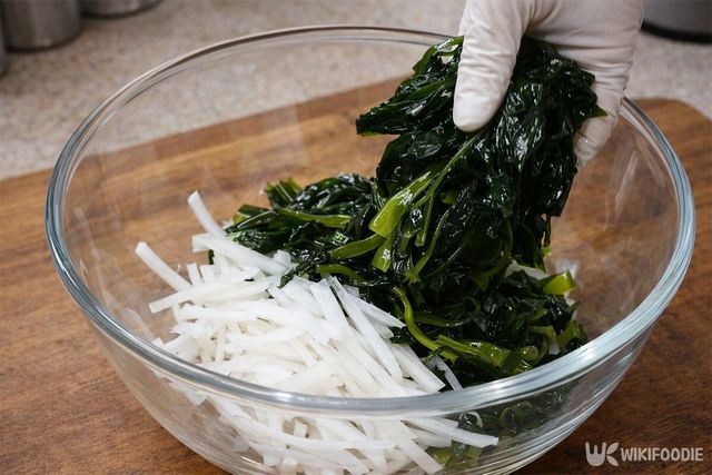 물미역에는 미끈한 점액과 불순물이 붙어 있다. 그대로 씻으면 잘 떨어지지 않는다. 이때 밀가루 한 스푼을 넣어 조물조물 주물러 씻으면 표면에 붙은 이물질이 쉽게 떨어진다.