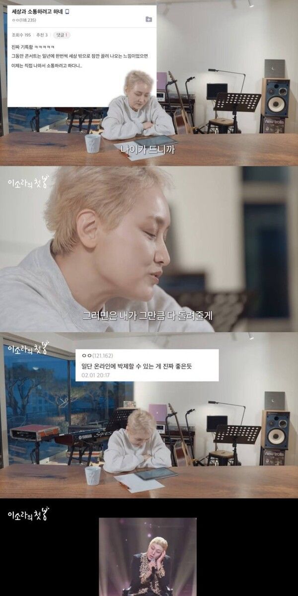유튜브 시청 경험이 1년도 채 되지 않는다는 이소라는 개그우먼 이수지의 패러디 영상을 언급하며 유쾌한 반응을 보이기도 했다. 그녀는 이제 전보다 마음이 더 열려 있다며 팬들에게 덜 까다로운 모습으로 다가가겠다고 다짐했다.