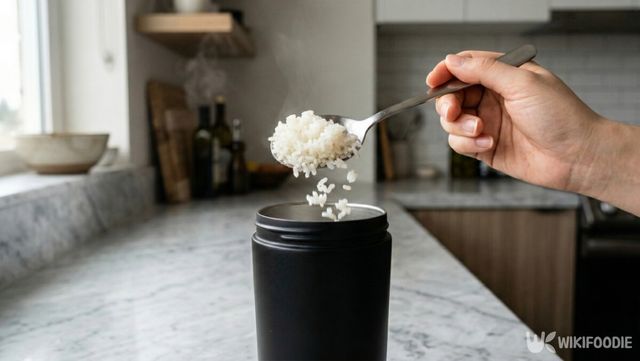 여기에 쌀밥을 밥숟가락으로 한 숟가락 넣는다. 밥이 너무 뜨거우면 사용할 때 불편하므로 약간 식은 밥을 넣는 편이 좋다. 밥알이 서로 달라붙어 있다면, 손으로 가볍게 풀어 넣는다.