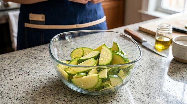 가장 먼저 주재료인 애호박 1개를 깨끗이 씻어 준비한다. 애호박을 길게 반으로 가른 뒤, 약 0.5cm 두께의 반달 모양으로 썰어준다. 이때 썰어둔 애호박을 참치액 2큰술에 미리 버무려 두는 과정이 이번 조리법의 핵심이다. 이렇게 미리 절여두면 애호박 속까지 짭조름한 감칠맛이 깊게 스며들어 씹을 때마다 풍미가 살아난다.