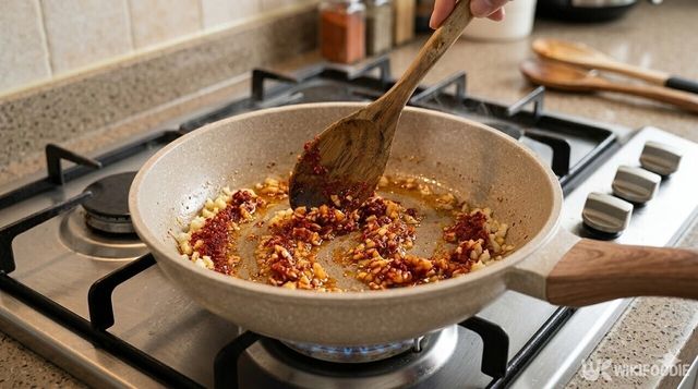 4. 마늘 향이 올라오면 고춧가루 1/2큰술을 넣어 타지 않게 고추기름을 만든다.