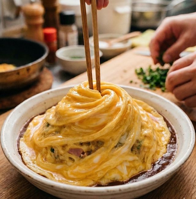 특히 일본 현지 식당에서는 일반적인 얇은 계란 지단 대신, 계란이 소용돌이처럼 말려 올라간 독특한 모양의 오므라이스를 종종 볼 수 있다.