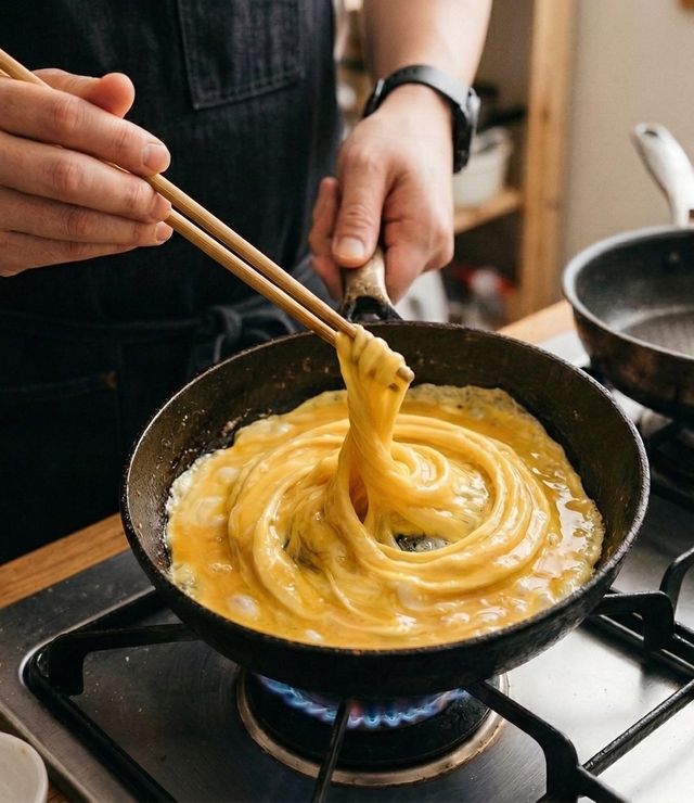 소용돌이 모양 계란 지단을 만들기 위해 달궈진 프라이팬에 올린 계란물을 젓가락으로 집어 돌리는 모습. 기사 이해를 돕기 위해 AI를 활용해 제작한 자료 사진입니다. 실제 모습과 다소 차이가 있을 수 있습니다.