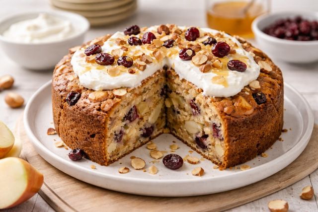 완성된 케이크를 식힌 후에 그릭 요거트를 올리는 것도 좋다. 요거트의 산미가 사과 아몬드 케이크의 묵직한 고소함과 대비를 이뤄 풍미를 더욱 깊게 만든다.