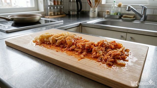 묵은지는 속을 살짝 털어내고 0.5cm 폭으로 길게 채 썬 뒤, 가로 방향으로 다시 1.5cm 길이가 되도록 잘게 썰어 준비한다.