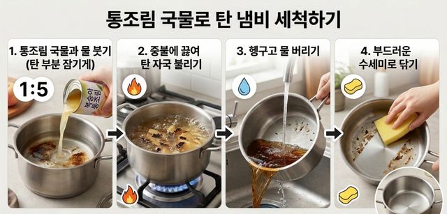 이 상태에서 냄비를 중불에 올려 끓인다. 물이 끓기 시작하면 눌어붙었던 탄 자국이 점차 불어오르며 떨어지기 시작한다. 끓이는 과정에서 바닥에 붙어 있던 덩어리들이 자연스럽게 분리되는 것을 확인할 수 있다. 이후 불을 끄고 물을 버린 뒤 냄비를 헹궈준다.
