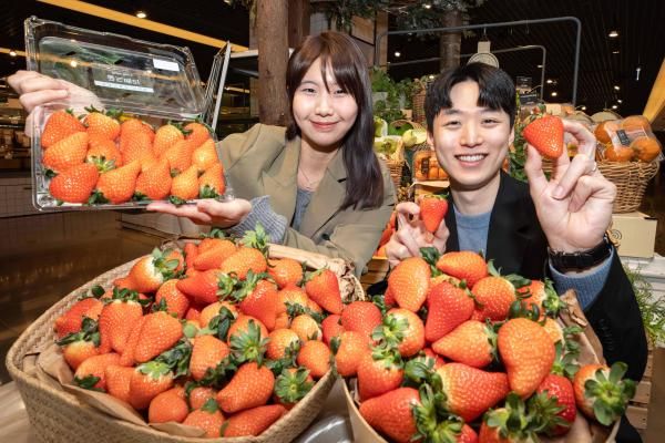 8일 서울 강남구 현대백화점 무역센터점 지하1층 식품관에서 직원들이 국내산 신품종 '골드베리딸기'를 소개하고 있다. 이번에 선보이는 골드베리딸기는 평균 당도가 14브릭스(Brix) 내외로 11~12브릭스인 일반 딸기보다 당도가 높고 단단하며, 아삭한 식감이 특징이다. 현대백화점은 다음 달 30일까지 압구정본점, 무역센터점, 판교점 등 전국 10개 점포 식품관에서 골드베리딸기를 판매한다. 판매 가격은 1팩(500g)에 2만 5000원이다. [사진=현대백화점]