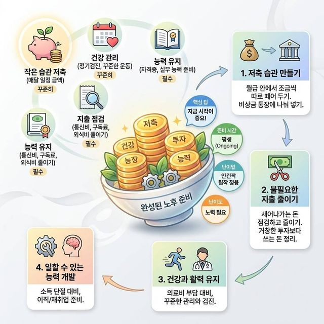 또 통신비, 구독료, 외식비처럼 새어나가는 돈을 점검해 불필요한 지출을 줄이는 것도 현실적인 노후 대비 방법으로 꼽힌다. 결국 노후 준비는 거창한 투자보다, 지금 쓰는 돈을 정리하고 작은 돈이라도 꾸준히 모으는 데서 시작된다고 볼 수 있다.