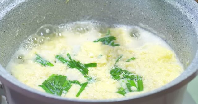 계란이 부드럽게 익기 시작하면 마지막으로 썰어 둔 부추를 넣는다. 부추는 오래 끓이면 향이 줄어들고 식감이 무를 수 있기 때문에 가장 마지막에 넣는 것이 중요하다. 부추를 넣은 뒤에는 약 20초 정도만 끓이면 충분하다.