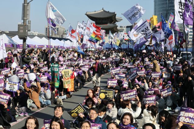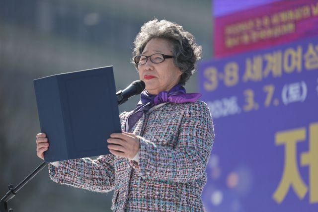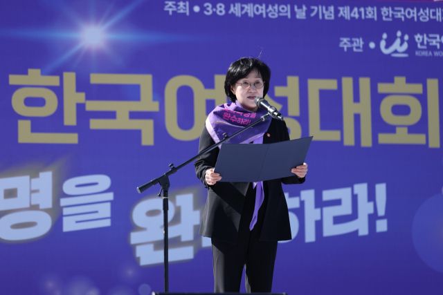 한국여성단체연합은 대회사에서 "내란 종식과 더불어 차별과 혐오 없는 세상, 모든 사람이 동등한 권리를 보장받는 사회로 나아가야 한다"며 "지연된 여성·성평등 의제들을 우리 사회의 중심 과제로 세워야 한다"고 촉구했다.