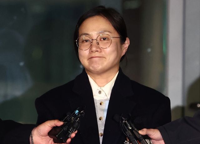 전직 매니저들에게 갑질을 했다는 등의 의혹에 휩싸인 개그우먼 박나래가 지난달 20일 서울 강남경찰서에서 피고발인 조사를 마치고 나오며 취재진 질의에 답변하고 있는 모습. / 뉴스1