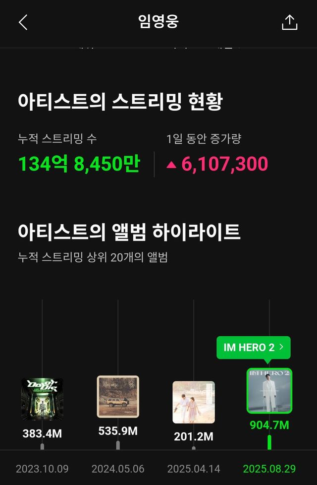 [스포츠동아 양형모 기자] 임영웅 정규 2집 ‘IM HERO 2’ 수록곡 11곡이 멜론 누적 스트리밍 9억회를 돌파하며 팬덤 ‘영웅시대’의 압도적인 화력을 다시 보여줬다.