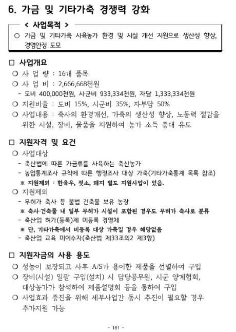 ‘가금 및 기타가축 사육농가 지원사업’은 시설 현대화를 통한 축사 환경 개선, 방역 물품 지원 등을 통한 생산성 향상이 주요 내용이다.