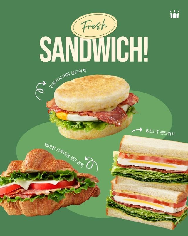 이번 신메뉴는 주문과 동시에 매장에서 직접 만들어 신선함을 그대로 즐길 수 있는 샌드위치 3종이다. 특히 부드러운 식빵, 바삭한 크루아상, 쫄깃한 잉글리시 머핀 등 다양한 빵을 활용해 취향에 따라 선택할 수 있어 소비자들의 많은 관심이 기대된다.
