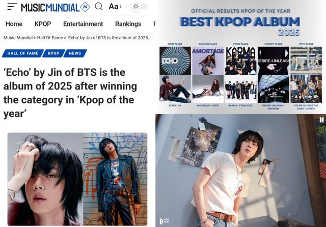 Music Mundial은 전 세계 투표를 바탕으로 ‘Echo’를 올해의 K팝 앨범 정상에 올렸다. 매체는 진을 가장 영향력 있는 솔로 아티스트 가운데 한 명으로 평가하며 앨범의 음악적 완성도와 글로벌 반응을 높게 봤다.