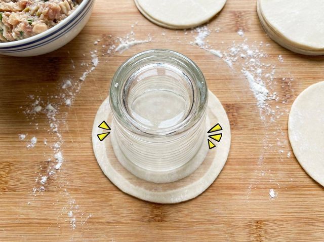 이 상태에서 컵 입구를 만두피 테두리에 맞춰 가볍게 찍어준다. 마치 도장을 찍듯 한 번 눌러주면 만두피 가장자리에 물이 일정하게 묻는다. 이후 만두소를 올리고 반으로 접으면 된다.