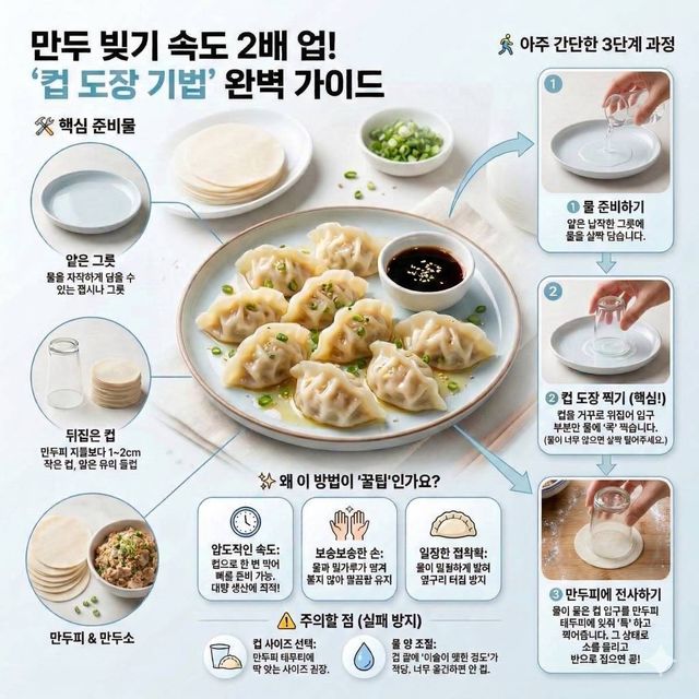 간단한 컵 하나로 만두피 준비 과정을 줄일 수 있는 이유는 원리가 단순하기 때문이다. 물을 균일하게 전달하는 도구 역할을 컵이 대신하는 방식이다. 집에 있는 컵을 뒤집어 물에 한 번 찍는 동작만으로도 만두 빚는 과정이 훨씬 간편해질 수 있다.