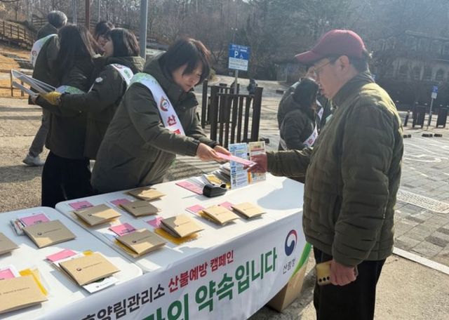 이날 국립자연휴양림관리소 직원들은 등산객과 시민들에게 산불 예방 수칙, 대피 및 신고 요령 등이 실린 안내문과 홍보물을 나눠주며 온라인 캠페인 참여를 독려하는 등 산불 예방의 중요성을 알렸다.