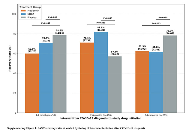 다만 감염 후 2~6개월 이내 환자군을 별도로 분석한 결과에서는 UDCA 투여군의 증상 개선 비율이 81.6%로, 위약군 57.1%보다 높게 나타났다(p=0.035).