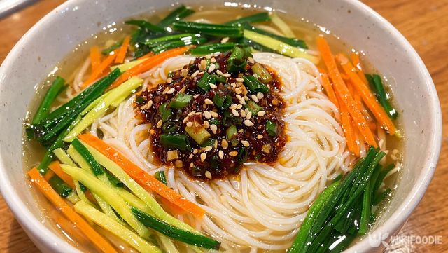 그릇에 물기를 뺀 소면을 보기 좋게 사리 지어 담는다. 그 위에 손질한 부추를 올린 뒤 뜨겁게 끓인 육수를 넉넉히 붓는다. 마지막으로 준비한 양념장을 1큰술 얹어내면 완성이다.