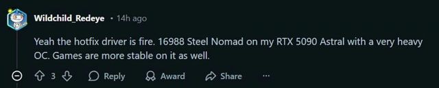 레딧에 올라온 사례를 보면, RTX 5080에서 3DMark 기록이 눈에 띄게 개선됐다. 타임 스파이 점수는 35,853점을 기록했고, 스틸 노마드에서는 99.72FPS가 나왔다. 이전에는 92.23FPS 수준이었다. 단순 드라이버 업데이트만으로 스틸 노마드에서 약 7% 오른 셈이다.