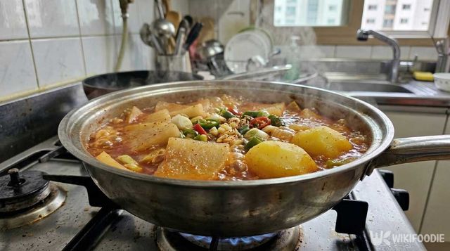 국물이 끓기 시작하면 무를 먼저 넣는다. 무는 오래 끓일수록 단맛이 국물에 퍼진다. 무가 어느 정도 익으면 감자를 넣어 국물의 깊이를 더한다. 이어서 양파를 넣어 자연스러운 단맛을 보태 준다.