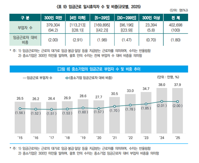 부업을 병행하는 중소기업 임금근로자는 37.9만 명으로 코로나19 이후 37.1% 증가했다. 이는 부업을 하는 전체 임금근로자의 94.2%에 해당한다. 임시직 부업자 비중은 4인 이하 소기업에서 53.5%로 가장 높았으며 300인 이상 대기업의 21.8%를 크게 웃돌았다. 중소기업과 대기업 간의 임금 격차 확대가 부업 인구 유입의 주된 원인으로 지목된다. 대기업 대비 중소기업의 평균임금 비중은 2020년 60.9%에서 2025년 57.7%로 하락했다.