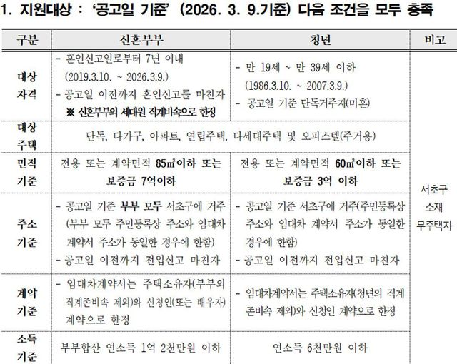 지원 대상은 공고일인 2026년 3월 9일을 기준으로 서초구에 전입신고를 마치고 실제 거주 중인 무주택 가구다. 신혼부부의 경우 혼인신고일로부터 7년 이내인 가구가 해당하며 부부 모두 무주택자여야 한다. 소득 기준은 부부 합산 연 1억 2000만 원 이하이며 전용 면적 또는 계약 면적이 85㎡ 이하이거나 임차보증금이 7억 원 이하인 주택에 거주해야 한다. 청년은 만 19세 이상에서 39세 이하인 무주택자로 연 소득 6000만 원 이하인 경우 신청할 수 있다. 주거 요건은 전용 면적 60㎡ 이하 또는 보증금 3억 원 이하의 주택이다.