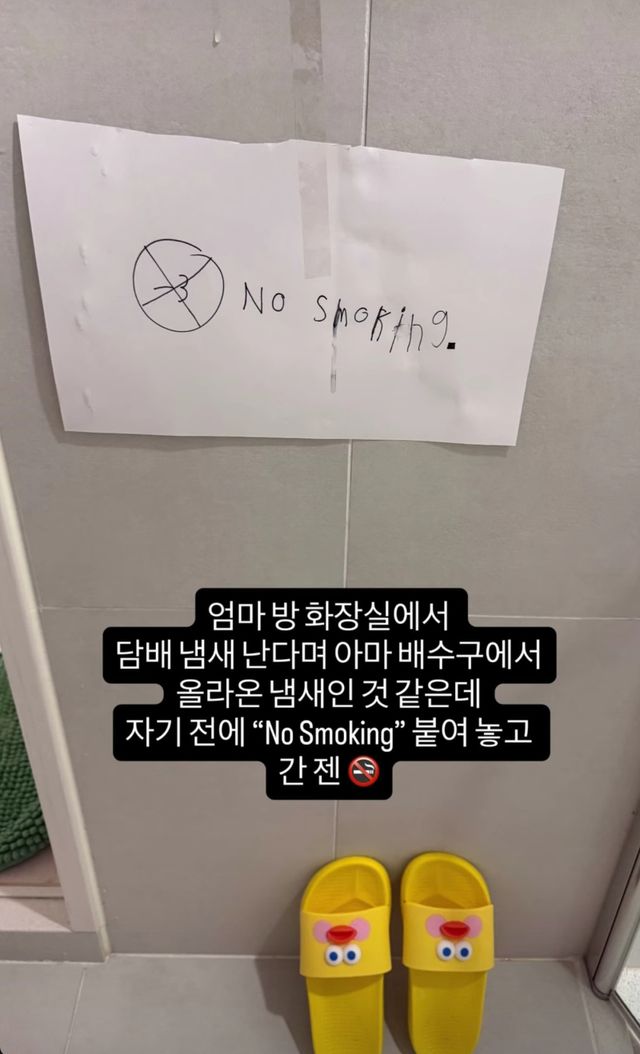 이와 함께 사유리는 “엄마 방 화장실에서 담배 냄새가 난다며 자기 전에 ‘노 스모킹’을 붙여놓고 간 젠”이라며 “배수구에서 올라온 냄새인 것 같은데”라고 덧붙였다.