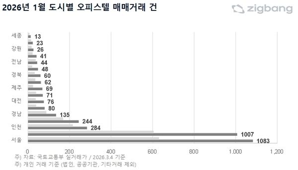 9일 직방이 국토교통부 실거래가 자료를 분석한 결과, 지난 1월 전국 오피스텔 거래량(개인 거래 기준)은 3366건으로 집계됐다. 이는 전년 동월(2033건) 대비 65.6% 증가한 수치다.