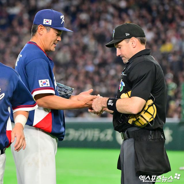 그러나 한국은 2회말 수비 시작 전 손주영이 팔꿈치 통증을 호소, 갑작스럽게 투수를 교체할 수밖에 없었다. 류지현 감독은 손주영의 상태를 직접 체크한 뒤 노경은을 마운드에 올렸다.
