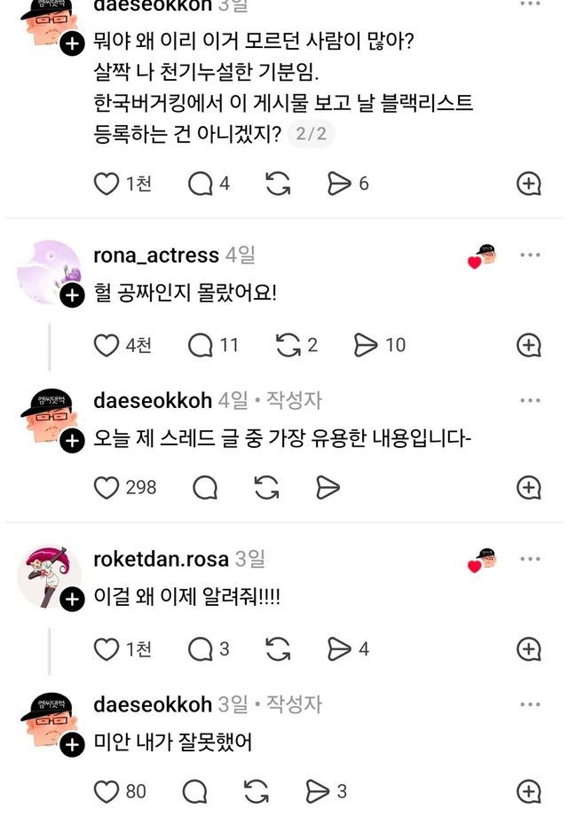 - 블랙리스트 걱정: 작성자는 "한국버거킹에서 이 게시물 보고 날 블랙리스트 등록하는 건 아니겠지?"라며 위트 섞인 우려를 표할 정도로 이 정보의 파급력이 클 것임을 예상했습니다.