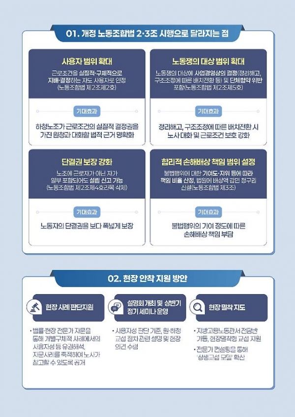 개정 노조법은 크게 사용자와 노동쟁의 개념 등을 규정한 2조와 노조 활동 관련 손해배상 청구 및 배상 책임을 다룬 3조로 구분된다. 노란봉투법 시행으로 사용자성이 확대되면서 원청 사용자 입장에선 교섭 대상이 기존보다 늘었다.