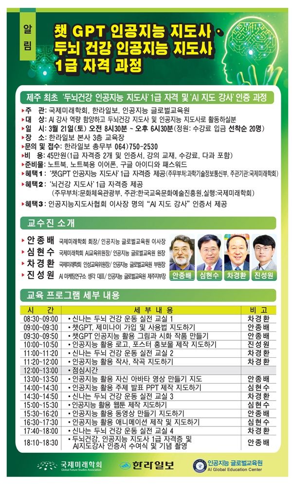 [한라일보] AI 인류혁명 시대를 선도할 새로운 교육 과정이 제주에서 처음으로 개설된다. 국제미래학회와 한라일보, 인공지능 글로벌교육원은 3월 21일(토) 오전 8시30분부터 오후 6시30분까지 제주 한라일보 본사 3층에 위치한 미래창의캠퍼스 교육장에서 ‘두뇌건강 인공지능지도사 1급 및 AI 지도 강사 인증 과정’을 전일제로 개최한다.